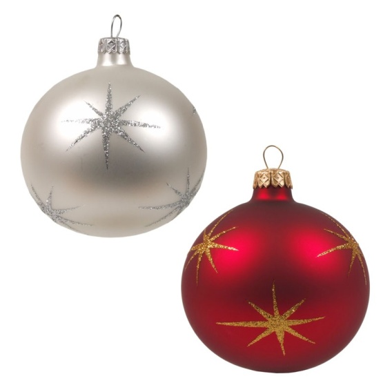 Na zamówienie wykonujemy ręcznie na szklanych bombkach gwiazdki z brokatu. W zależności od wielkości bombki zwykle około 6-8 gwiazdek na bombkę.